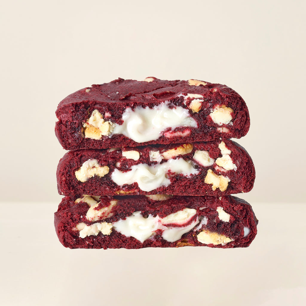 Each thick, soft-baked cookie is rich in classic red velvet flavour, studded with creamy white chocolate chips, and filled with a smooth creamy centre. It's an indulgent blend that delivers dessert-style satisfaction in every bite.